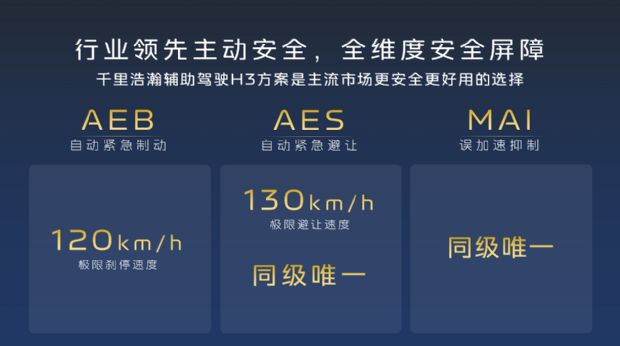 辅助驾驶功能以安全第一为准则,为了让用户获得性能更好同时又更加安全的辅助驾驶体验,在本次OTA升级中,吉利银河A7首搭千里浩瀚辅助驾驶H3方案再进阶,可实现越级主动安全,成为同级唯一具备自动紧急避让(AES)和误加速抑制(MAI)能力的车型。